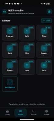 In addition to its functionality, BLE Controller boasts a beautiful modern design. With a clean and intuitive user interface, support for dark and light modes, smooth animations and transitions, and a grid-based button layout for easy access, the app is optimized for one-handed use. It also offers smart features such as an edit mode for quick customization, default button templates, and persistent settings.
