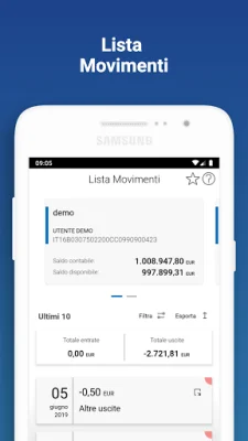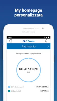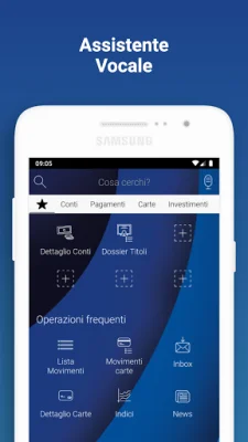 L'applicazione è un servizio bancario che offre una dashboard personalizzabile per visualizzare informazioni sui conti, carte, mercati, investimenti, finanziamenti, documenti e vincoli. La homepage può essere personalizzata per mostrare i pannelli più importanti per l'utente. Inoltre, l'applicazione offre un assistente vocale che permette di accedere alle funzionalità di saldo, lista movimenti, documenti e bonifici tramite una conversazione con l'applicazione. La ricerca delle funzionalità è facilitata dalla possibilità di cercare per nome o tag all'interno del menu di navigazione, e anche tramite la funzionalità di text to speech che permette di dettare le parole da cercare. Inoltre, è possibile nascondere i dati sensibili come liquidità e controvalori per una maggiore sicurezza.