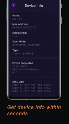 The Bluetooth Device Info feature provides detailed information about detected Bluetooth devices, including their names, signal strengths, device types, and battery levels (if supported by the device). This allows you to make informed decisions about which devices to connect to or interact with, making your Bluetooth experience even more efficient and personalized.