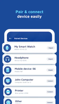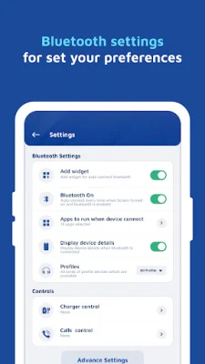 This application is designed to make managing your Bluetooth connections easier and more convenient. It has a variety of features that allow you to prioritize and automatically connect to your preferred devices, restart connections, and turn Bluetooth on and off directly from the app. You can also scan for nearby devices and filter them by type, as well as customize notification sounds and choose which app opens when you turn on Bluetooth. The Bluetooth connection features include the ability to automatically connect when your screen is turned on and Bluetooth is enabled, as well as when a device is paired with your device. You can also set a timer to turn off your Bluetooth and choose a notification sound for connection alerts. Additionally, you can select which app opens when you turn on Bluetooth from the app. The device control features allow you to turn Bluetooth on and off when your charger is plugged in or out, as well as when you make or receive a call. There are also advanced features for connectivity, such as the ability to set the number of times a device will retry connecting to your device, the gap between connection attempts, and the device timeout. You can also use profile filters to only display certain types of devices. The app also offers different theme options, including a dark and light mode. In order to function properly, the app requires certain permissions. These include location permission for scanning nearby devices, phone permission for turning Bluetooth on and off during calls, and permission to scan for nearby Bluetooth devices. The app also requires permission to draw over other apps in order to display device details when a device is connected.