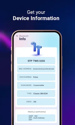 The app also offers a Bluetooth Info feature, which allows you to scan for nearby devices and manage your connected devices. You can also get detailed information about your Bluetooth connected devices, giving you a better understanding of their capabilities and settings.