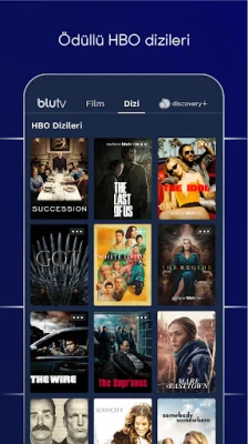 BluTV offers a wide selection of exclusive local TV series and programs, as well as popular HBO series and productions from discovery+. Some of the popular titles include "Çekiç ve Gül: Bir Behzat Ç. Hikayesi", "Magarsus", "Sokağın Çocukları", "Bozkır", "Kıyma", "Saygı", "İlk ve Son", "Alef", "Aynen Aynen", "Doğu", "Yalnızım Mesut Bey," "The Last of Us", "Game of Thrones", "House of the Dragon", "Westworld", "Succession", "Sex and the City", "True Detective", "The Sopranos", "Euphoria", and "Chernobyl."
