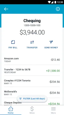 The app offers a variety of features to make banking on the go a breeze. You can view your account balances and transaction history, transfer funds between accounts (including cross-currency transfers), and send Interac e-Transfers. You can also pay bills, manage payees, and set up future-dated bill payments. For a more detailed look at your accounts, you can view information such as credit card balances, due dates, minimum payments, mortgage details, and funds on hold.