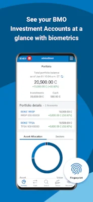 The BMO Invest app allows users to easily access and manage their InvestorLine or Nesbitt Burns holdings and account details. With Portfolio View, users can get an aggregated view of their investments and set up custom watchlists to monitor stocks and market trends. The app also offers the convenience and security of using Fingerprint Biometrics to access accounts.