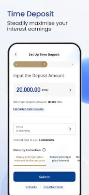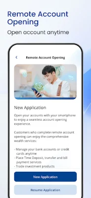 Remote Account Opening is an innovative application that allows users to open a bank account without having to physically visit a branch. This convenient feature allows individuals to access comprehensive financial services from the comfort of their own home. With just a few clicks, users can complete the account opening process and start enjoying all the benefits of the bank's services. The application's new homepage provides users with a quick and easy way to access their banking services and account information. With a simple glance, users can view and manage all their accounts, making it easier to keep track of their finances. This feature puts all the necessary information at the user's fingertips, making banking more convenient and efficient. The Transfer & Payment feature of the application allows users to make payments and transfers in a secure and convenient way. Users can pay friends using FPS (Faster Payment System) and pay bills with their accounts or credit cards for various merchants. This feature is available 24 hours a day, providing users with flexibility and convenience in managing their finances. The Mobile Token feature of the application ensures the safety and security of users' accounts and transactions. With the option of using Mobile Token or Biometric Authentication, users can authenticate their accounts without the need for a physical Security Device. This feature is available for both Mobile Banking and Personal Internet Banking, making it easier for users to access their accounts and conduct transactions securely. The Wealth Management feature of the application offers various functions and the latest investment insights to help users make informed decisions and capture investment opportunities. This feature allows users to manage their wealth and investments conveniently, making it easier to grow their finances. Experience the convenience and efficiency of our brand-new Mobile Banking Services now! With a focus on originality and SEO optimization, this application is designed to provide users with a seamless and user-friendly banking experience. So why wait? Download the application and start enjoying all the benefits it has to offer.