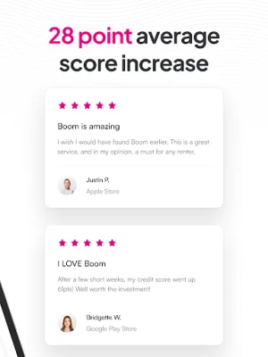 Boom is an application that helps renters build their credit by reporting their rent payments to all three major credit bureaus - Experian, TransUnion, and Equifax. This allows renters to see the maximum impact of their largest monthly payment on their credit score. By using Boom, renters can easily build and track their credit, with an average credit score increase of 28 points and some users seeing increases of over 105 points.