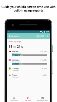 Boomerang Parental Control is an application that helps parents foster healthy technology habits for their children. It offers a variety of tools to monitor, manage, and guide a child's digital experiences. The app provides daily email reports to parents, allowing them to have conversations with their child about their online activities and interests. One of the main features of Boomerang is its ability to transform screen time battles into opportunities for growth. This is achieved through its robust features for Android devices. Parents can set daily device time limits and schedules to encourage balanced tech use. Detailed app usage reports are also available to provide insights into a child's digital habits. Boomerang also offers tools to guide and teach good screen time habits. The app includes a safe browsing feature, which uses the SPIN Safe Browser or Google Chrome to enforce Google SafeSearch and block inappropriate websites. Parents can also monitor and control app installations and usage, as well as access their child's YouTube viewing and search history. In addition, Boomerang allows parents to promote positive screen time by setting preferences for educational and beneficial apps. The app also offers a variety of resources, such as a Knowledge Base for frequently asked questions and a Support Team that can be contacted for assistance. It is important to note that Boomerang requires certain permissions, such as Device Administrator and AccessibilityService API, to perform key functions. It also utilizes Samsung Knox to enhance the security of Samsung devices and Notification Access to mute notifications when time's up. The app is compatible with Android 5.x and higher. Overall, Boomerang Parental Control is a trusted partner for parents looking to create a healthy digital environment for their children. With its comprehensive tools and features, it aims to balance screen time, safeguard online activities, and encourage positive digital habits. Parents can download the app today and take the first step towards empowering their child's digital wellbeing.