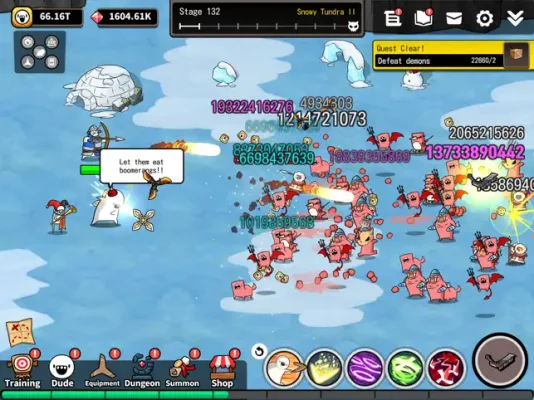In this game, your main weapon is a boomerang, which you will use to aim and throw at the demons. But don't worry, you won't be alone in this fight. You can train and team up with other powerful Dudes to take down the demons together. The more you train, the stronger you will become, and the more powerful your boomerang will be.
