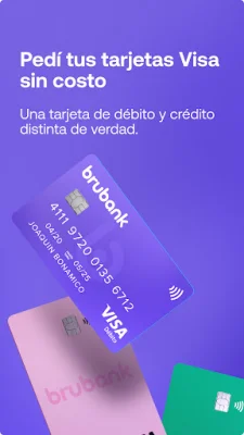 En Brubank encontrarás una tarjeta de débito y crédito Visa, con la que podrás ahorrar gracias a las promociones en los mejores comercios. Además, es una tarjeta 100% internacional que te permite elegir pagar en pesos o dólares, y recibir notificaciones cada vez que realices una compra. También ofrece máxima seguridad, permitiéndote pausar o reportar la tarjeta desde la aplicación, y puedes elegir entre tres colores: verde, rosa o violeta.