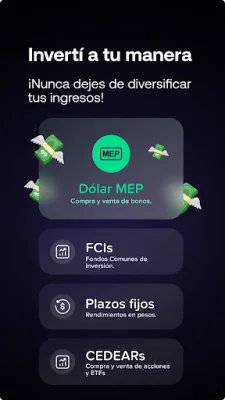 Otra de las funciones de Brubank es la posibilidad de realizar inversiones, como comprar dólares MEP y recibirlos en 24 horas, invertir en Fondos Comunes de Inversión utilizando las recetas de Fondos que te ayudan a diversificar tu inversión, o invertir en empresas mundiales a través de CEDEARs sin necesidad de abrir una cuenta en el exterior. También puedes generar rendimientos con las mejores tasas a través de plazos fijos.