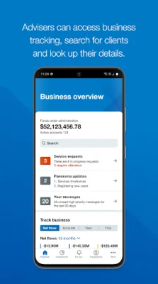 For BT Panorama advisers, the app offers a business overview dashboard where you can view a summary of your total funds under administration, active accounts, net flows, and fees. You can also search client accounts and see their total portfolio balance and performance details. The app also allows you to access market information for shares and managed funds in your clients' portfolios, make transactions for various investment types, and view messages and updates from BT.