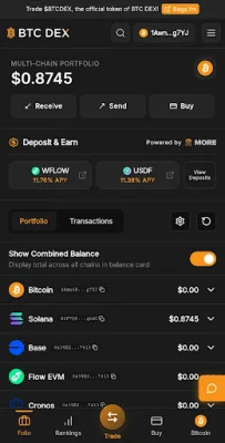 BTC DEX also provides a multichain portfolio management feature, allowing users to track and manage their assets across multiple blockchains in one unified interface. This includes viewing balances, transaction history, and portfolio performance across Bitcoin, Solana, Base, Flow EVM, and Cronos.