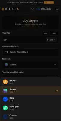 The BTC DEX is a decentralized exchange that allows users to securely and easily manage their Bitcoin and cryptocurrency assets across multiple blockchains. It offers a variety of features such as buying, selling, sending, receiving, and swapping major cryptocurrencies like Bitcoin, Ethereum, Solana, Base, Flow EVM, Cronos, and thousands of tokens across SVM and EVM ecosystems. The exchange also provides aggregated liquidity for the best rates and seamless cross-chain swaps.