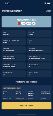 This application allows users to quickly sign up using their email or social media accounts. Once signed up, users can participate in an interactive walkthrough to familiarize themselves with the app. The main feature of the app is the ability to select real horses and jockeys competing in actual races and earn points based on their performance. These points are accumulated and contribute to a user's season-long ranking.