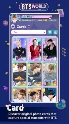 This application is about protecting the memories of the popular K-pop group BTS from a "Time Stealer" who wants to ruin them. The app allows users to interact with the members in themed lobbies, recall hidden memories, collect photo cards, and utilize their skills to battle against the Time Stealer. Users can also create their own special space filled with BTS memories and add friends to help BTS grow. The app requires certain permissions to function properly, but users can choose to block access if desired. It is developed by BIGHIT MUSIC / HYBE & TakeOne Company and is available for Android devices with certain specifications.