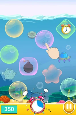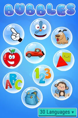 In addition to the language options, the game also offers 4 different game modes. The first is a time-challenge, where children can try to pop as many bubbles as they can in under a minute and compete for the highest score. The second is an endless bubble game, which allows for continuous play and can be stopped at any time. The third option is a learning game, where children can select one of the 9 themes and learn new words. And finally, there is a quiz game where children can listen to a word and then find the bubble with the correct object.