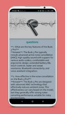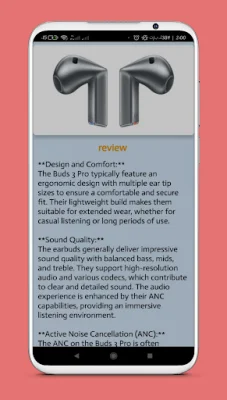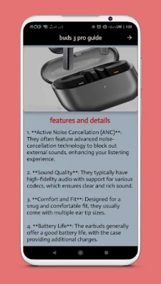 The content of the buds 3 pro guide app includes features and details of the headphones, a description of the product, frequently asked questions, and a user manual. The app is designed to be easy to use, with a simple and clear interface that provides users with all the necessary information about the buds 3 pro headphones.