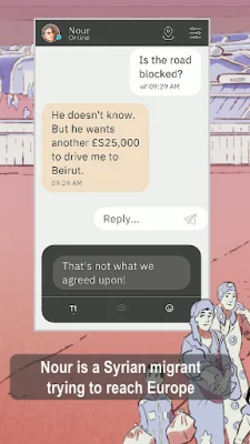 The game is a text messaging adventure, where players take on the role of Nour's husband, Majd, who remains in Syria and communicates with her through a messaging app. Majd advises Nour as she faces challenges and obstacles on her journey, with the ultimate goal of reaching Europe safely.