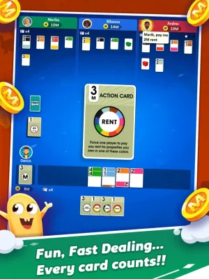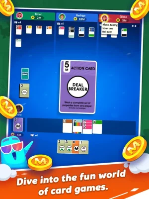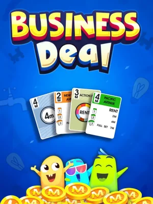 The objective of the game is to be the first player to collect three full property sets of different colors. Business Deal is a card game that can be played offline with 2 to 4 players. It includes 112 playing cards, such as rules cards, Mr. Monopoly cards, property cards, action cards, rent cards, and money cards. At the beginning of each turn, two cards are dealt, but if a player has no cards left, five cards are dealt. Players take turns playing up to three cards from their hand in a clockwise direction.