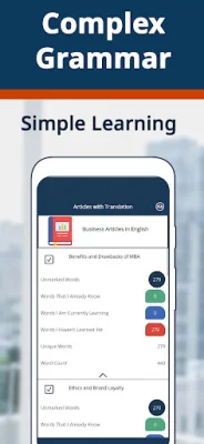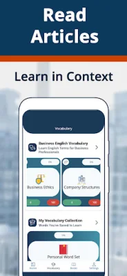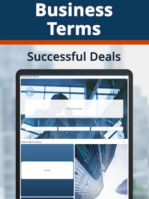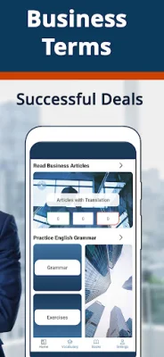 The app focuses on developing key business language skills, such as English for meetings, emails, and overall professional communication. It offers a flexible and goal-oriented format, allowing users to boost their skills with real-world content. This includes reading business texts, authentic emails, case studies, and reports with precise translations. Users can also practice vocabulary selection, learn business English terms through flashcards, and explore a complete grammar section with relevant examples.