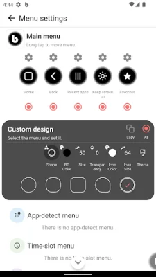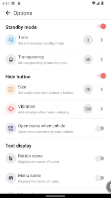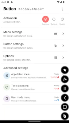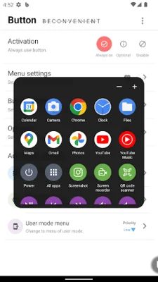 To use this app, you will need to grant it the 'Display over other apps' permission. This allows the app's button to be displayed on top of other apps. You can choose to have the button always visible or only when the app is launched or at a set time. Tapping the button once will bring up a menu of available options, and tapping it again will close the menu. You can customize the menu and button with the features and designs that you need.