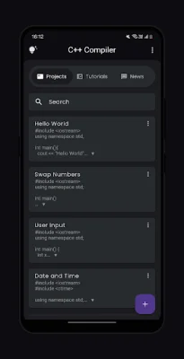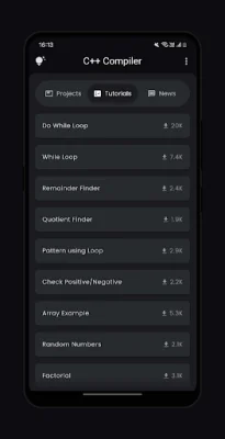 The C++ Compiler app also offers a tutorials and news section, where you can stay updated with the latest in Python development. This integrated feature provides tutorials, news, and updates on new techniques, best practices, and industry trends. You can also bookmark important code snippets and projects for quick access and manage your projects efficiently with the built-in project organization tools. With all these features, the C++ Compiler app is your ultimate coding companion, whether you're a beginner or an experienced programmer.