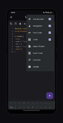 The navigation layout in the app is designed to make code navigation effortless. It allows you to move your cursor smoothly and intuitively, making it easier to navigate through your code and make changes. Another useful feature is the scan code feature, which lets you quickly import code snippets using your device's camera. This is perfect for grabbing code from textbooks, whiteboards, or printed documents.