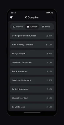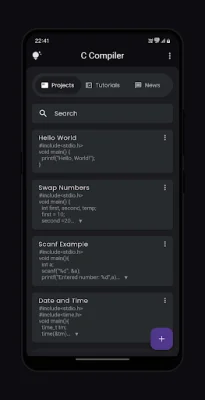 The app also offers a tutorials and news section, where you can stay updated with the latest in Python development. This integrated feature provides access to tutorials, news, and industry trends, helping you learn new techniques and best practices. You can also bookmark important code snippets and projects for quick access, and manage your projects efficiently with the built-in project organization tools. With the C Compiler app, you can elevate your coding experience and take your skills to the next level.
