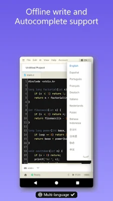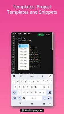 One of the standout features of this app is its smart offline autocomplete, which suggests code as the user types, making coding faster and more efficient. It also offers a wide range of customization options, including 40+ editor themes and 10+ code fonts to suit individual preferences. The app supports multi-file projects and provides 50+ one-click run offline examples and templates for quick start. Additionally, there are 38+ offline code snippets available for faster development.