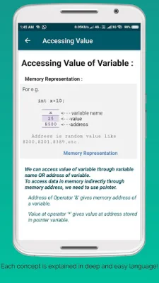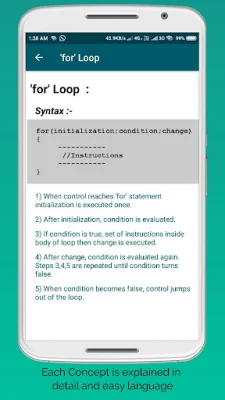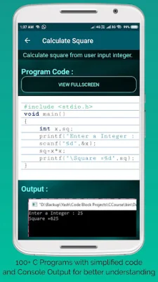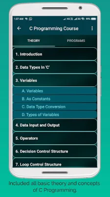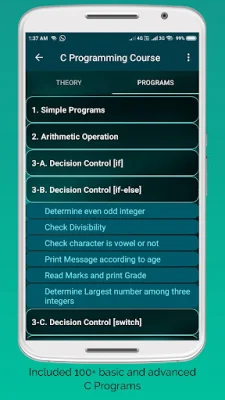 The app covers all the basic concepts of C programming, making it suitable for beginners. It includes all the necessary theory to help users understand the language and its principles. Additionally, there are nearly 100 executable programs with console outputs, making it easy for users to see the results of their code.