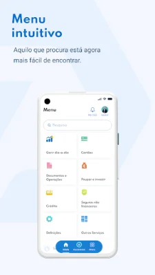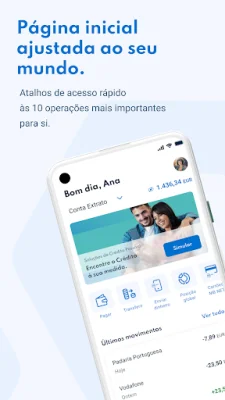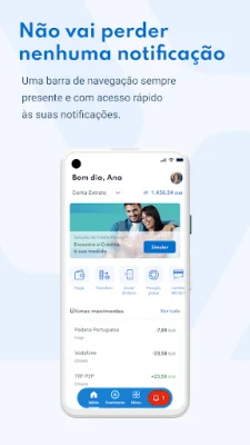A experiência de utilização da aplicação é facilitada pela página inicial com acesso rápido às operações do dia a dia, pela barra de navegação em permanência para não perder notificações importantes e pelo menu intuitivo que permite encontrar rapidamente o que procura.