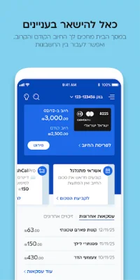 Cal's app is a convenient and comprehensive tool for managing your credit and debit cards. It allows you to easily track your transactions, change billing dates, increase credit lines, stop direct debits, and even apply for loans. The app constantly updates your information and provides detailed information about all your cards, including Visa, MasterCard, Diners, and debit cards. You can also enroll in Google Pay through the app, making it easier to make payments from your mobile device both in Israel and abroad.