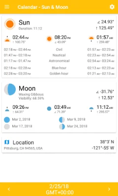 Some key features of this application include sunrise and sunset times, different types of twilight, moonrise and moonset times, and lunar phase and illumination. It also has an alarm and notification system, as well as the ability to view the azimuth and altitude of the sun and moon for any time of day or night. Users can select their location using GPS, map, numerical or address search, and the app automatically detects the time zone.