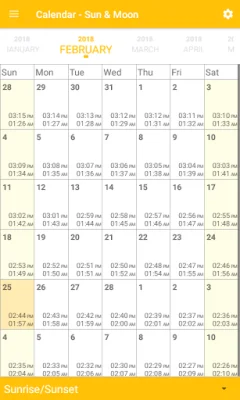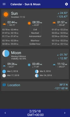 The application also has features that cater to outdoor enthusiasts such as fishermen and hunters. It can calculate the days and hours of maximum animal and fish activity based on the position of the sun and moon in the sky. This is based on the "Solunar theory" by John Alden Knight, which takes into account the moon's position in its orbit in relation to the observer.
