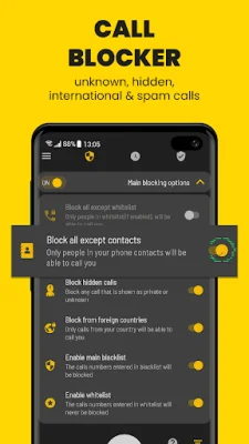 Call Blocker is a true "do not disturb" app as it blocks numbers from the blacklist silently without ringing. This means that once you ignore a call, the number will be deleted from your phone and will never disturb you again. The app also has a whitelist feature to ensure that your favorite contacts are not blocked.