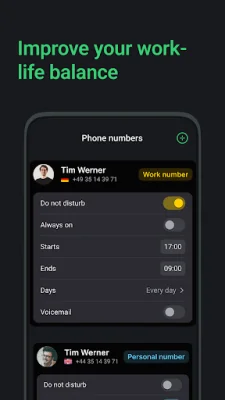 One of the key features of Call.com is its dual number management, which allows users to effortlessly maintain a second number for a better work-life balance. This feature is especially useful for individuals who want to keep their personal and professional lives separate.