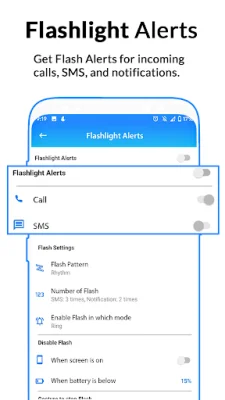 Users can also set up flashlight alerts for incoming calls, text messages, and notifications. The app offers various flash blinking patterns and allows users to set separate flash numbers for SMS and notifications. These alerts work in all modes and are automatically closed when the phone's battery is low.