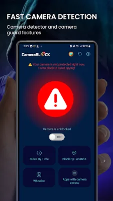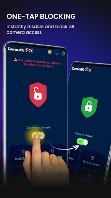 The Camera Blocker is an application that protects your privacy by preventing unauthorized photos and videos from being taken without your consent. With just one click, you can block your phone's camera from surveillance apps, giving you full 24/7 protection. This app is perfect for anyone who wants to keep their camera safe and secure.