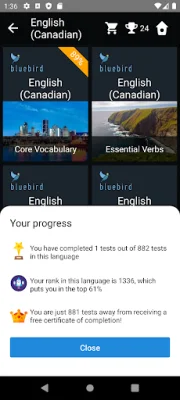 The comprehensive test can be taken at your own pace and over multiple days, with a leaderboard to track your progress and compare your rank to other test-takers worldwide. The rapid test uses progressively difficult questions to accurately assess your level of proficiency. This app is not designed to teach Canadian English, but rather to evaluate your existing knowledge and proficiency.