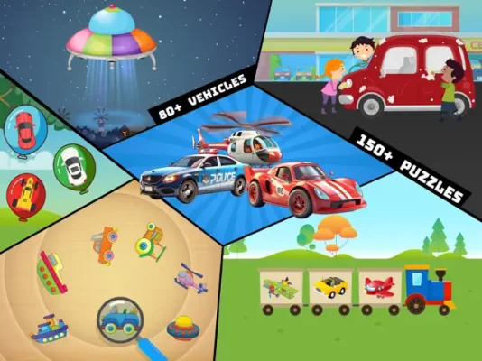 This application is a jigsaw puzzle game that is designed for young children. Each puzzle features a different vehicle and when completed, the child is rewarded with the sound of the vehicle and the word with pronunciation. This not only provides entertainment for the child, but also helps to build their vocabulary. The game is designed to help develop various skills such as spatial awareness, matching, cognitive abilities, memory, and fine motor skills. With its interactive features and engaging animations, children can play for hours and continue to benefit from the game.