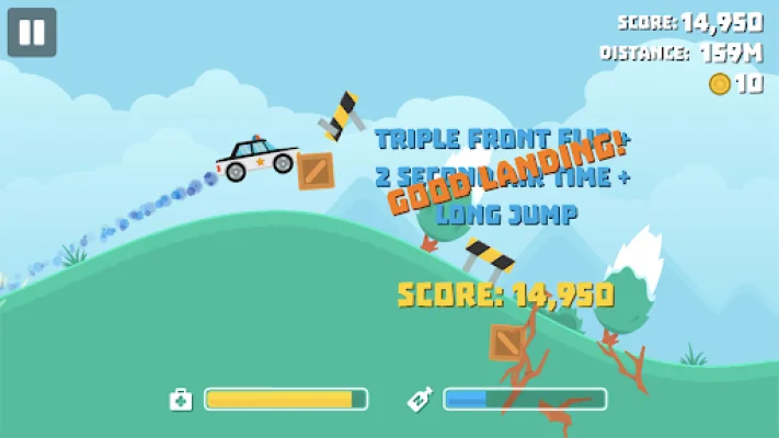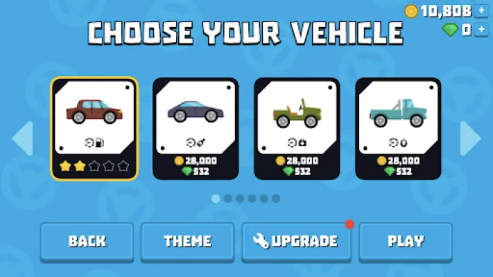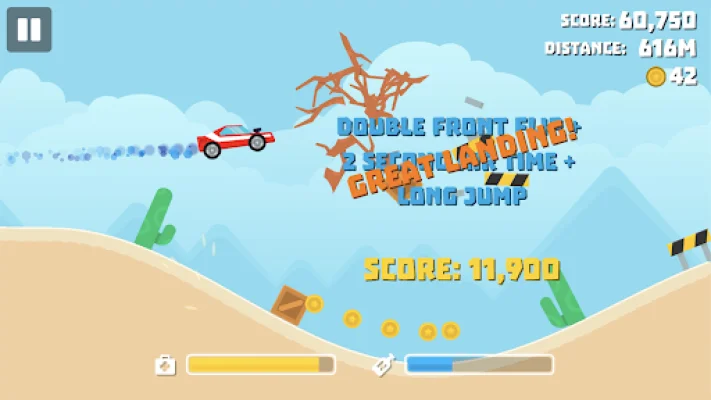 Master the Controls: In this game, you will have to use your skills to control your vehicle and master its movements. To rotate your vehicle while in the air, you can hold down the left or right button. For an extra boost, swipe up before jumping. If you want to slam your vehicle down while in mid-air, simply swipe down. And for a perfect landing, make sure to land both wheels at the same time. You can also perform stunts to earn nitros and keep going, even when you're low on fuel. Earn & Progress: As you drive, you can collect coins and the further you go, the bigger the bonus you will receive. To earn even more rewards, you can chain different tricks in a single jump for massive combo rewards. There are also daily rewards available on a 14-day rotating cycle. If you want to multiply your earnings, you can use coin doubler tokens. And to ensure peak performance, you can upgrade your vehicle across 8 different categories. Packed with Content: This game is packed with exciting content to keep you entertained for hours. There are 24 epic vehicles for you to unlock and master, each with its own unique abilities. You can also race through 5 colorful themes, adding variety to your gameplay. With endless fast-paced gameplay, every run will be different and challenging. You can earn score-based, combo-based, and distance-based coin bonuses to keep you motivated and striving for a higher score. How Far Can You Go?: Now it's time to put your skills to the test and see how far you can go in this game. With its challenging controls, endless gameplay, and various ways to earn rewards, this game will keep you engaged and entertained for hours. So, get ready to master the controls, earn and progress, and enjoy the packed content of this exciting game.