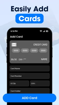Adding cards to the app is a quick and easy process. You can enter all the necessary information, such as card number, cardholder name, expiry date, and CVV, and store it safely in one convenient location. This eliminates the need to carry multiple cards or remember all the details for each one.