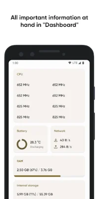 The "Dashboard" feature collects all the important information in one window, making it easier for users who don't want to go through a large amount of detailed information. This includes CPU usage, battery status, network usage, and memory load.