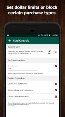 This application allows users to have more control over their credit or debit card usage. With this app, users can suspend their card usage for specific types of transactions such as ATM, international, and online transactions. This feature can be useful in case of a lost or stolen card, as it prevents unauthorized transactions from occurring. Users can also receive alerts for transaction amounts and types, providing them with real-time updates on their card activity.