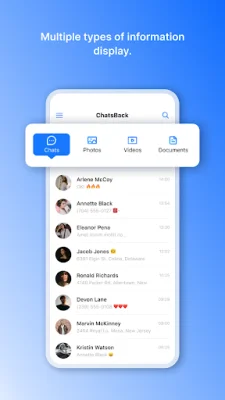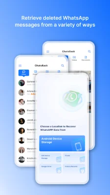 ChatsBack is a practical and simple application that allows users to retrieve deleted WhatsApp messages and attachments directly from various backups. This means that even if your friends have deleted messages or files from your conversations, you can still access them through this app. Additionally, ChatsBack allows you to view these deleted messages without the sender's knowledge, as well as read them without triggering the blue tick notification.