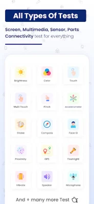 The app offers a variety of key tests to thoroughly examine the device. These include tests for the screen and display, multimedia features, sensors, device parts, connectivity, and other important checks. Each test is designed to assess a specific aspect of the device, such as brightness, color, touch screen functionality, sound quality, camera performance, and more.