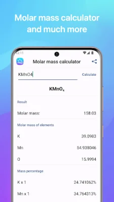 Another useful feature of the app is the calculator for molar masses. By entering a chemical compound correctly, users can see the molar masses and percentages of elements. This can be helpful for calculating the mass of a substance in a given reaction.
