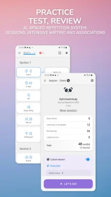 With our app, you can access pre-made lists of Chinese characters and words or create your own personalized lists. Simply enter the characters or words in Chinese and the app will provide translations. You can also download commonly used Chinese textbook word lists. The smart lists feature allows you to track your progress, review difficult elements, and check your previous errors. You can also browse, edit, and export your lists, as well as create writing sheets. The learning sessions focus on Chinese writing, translation, tones, and pronunciation.