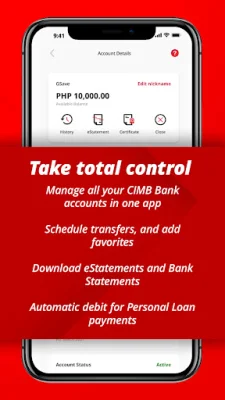 With the CIMB Bank PH app, users have total control over all their accounts, anytime and anywhere. They can schedule transfers, add accounts to favorites, download e-statements, manage their debit cards, and set up auto-debit for Personal Loan payments.