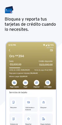 En caso de emergencia, podrás activar y bloquear temporalmente tus tarjetas, así como reportarlas por robo o extravío. También podrás consultar el saldo y movimientos de todas tus cuentas, realizar transferencias a cualquier banco sin comisiones y pagar tus tarjetas de crédito, departamentales, servicios e impuestos del SAT.